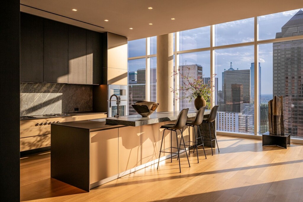 Floor-to-ceiling windows surround the main living areas, flooding the penthouse with natural light and framing unobstructed views of the Dallas Arts District. Throughout the day, the light shifts across the interiors, highlighting textures, materials, and art while maintaining a constant connection to the city below.